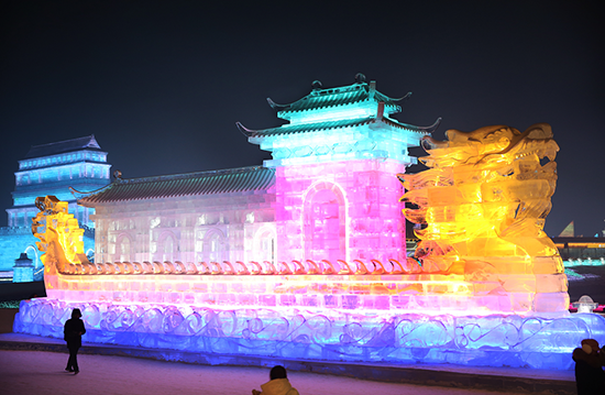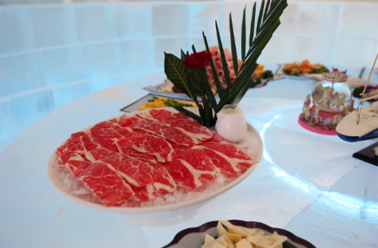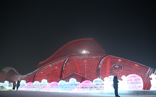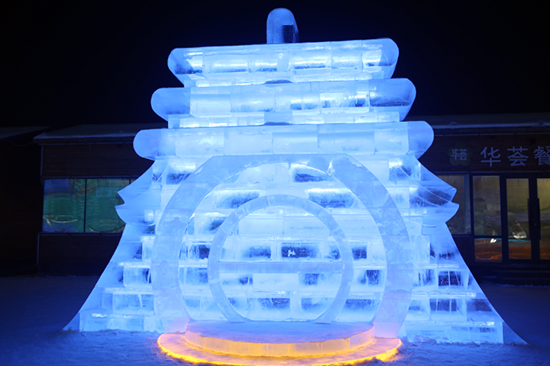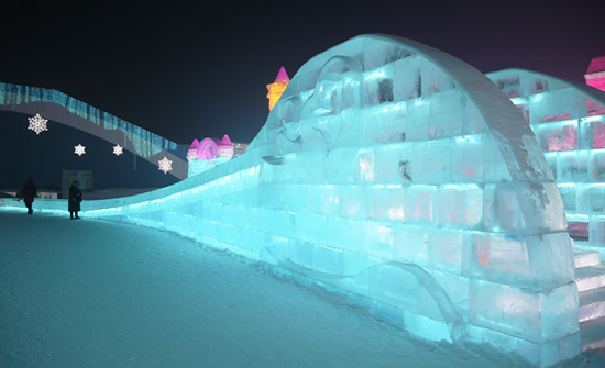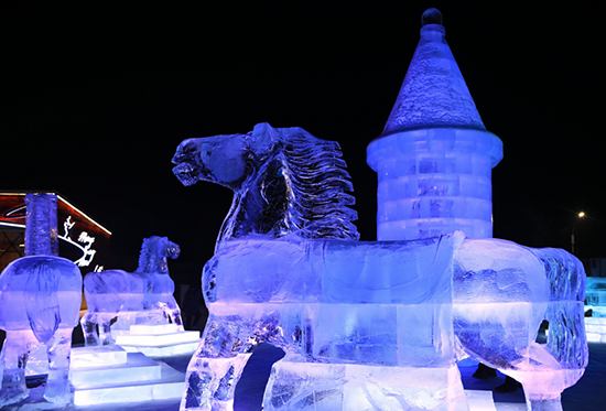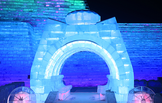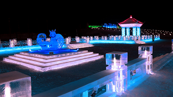 冰上娱乐区主要是为游客提供冰上娱乐项目的区域。这里的旋转木马,是最适合拍照的小景观;情侣滑梯,可以让两个人手拉手一起滑下;鲤鱼穿越,结合冰与非冰而建的一处景观,寓意年年有余。它的两旁便是“冰火锅”与“冰酒吧”,值得一探;另外这个区域还有剪影墙、北极冰原、冰上龙舟,结合了民俗元素、趣味元素,可爱不失庄重。