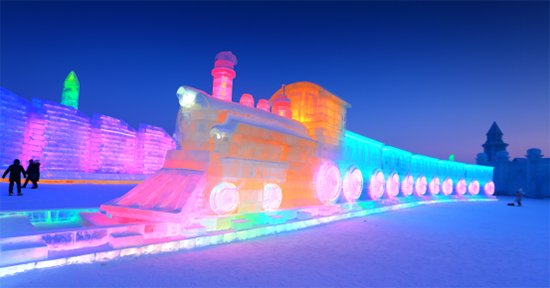 一列“行进”中的东方列车隆隆向前,载着哈尔滨冰雪大世界21年历程的故事与对未来的期待,一路向前。在这里,你可以登上列车,拍照留念。