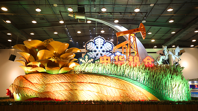 (黑龙江“中华粮仓”国庆彩车入驻冰雪大世界冰雪艺术宫)