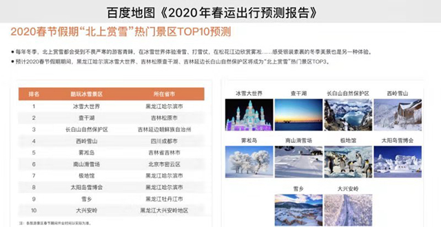 每年冬季,北上赏雪都会受到不畏严寒的游客青睐,在哈尔滨冰雪世界看晶莹剔透的冰雕景观,在太阳岛雪博会赏粉妆玉砌雪塑景观……感受银装素裹的冬季美景也是另一种体验。近日,哈尔滨冰雪大世界荣登百度地图《2020年春运出行预测报告》2020年春节假期“北上赏雪”热门景区 Top10排名的榜首,太阳岛雪博会位列热门景区 Top10排名第八位。