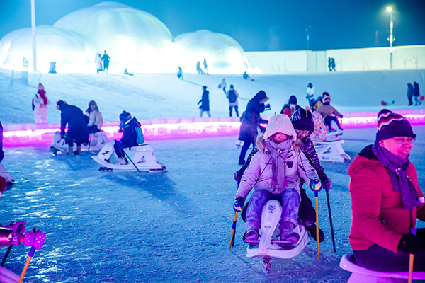 哈尔滨冰雪大世界的雪圈乐园,今年全面升级了保证让你从此对它欲罢不能。园区共有15条不同类型的雪道,有单人、双人、三人、四人、六人、儿童雪道,带着孩子感受直飞向下的冲刺感,乘坐雪圈在酷炫的冰雪上冲浪,感受冬日的速度与激情。
