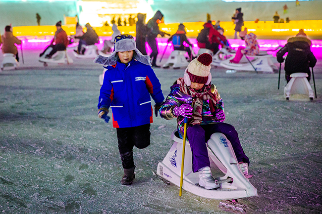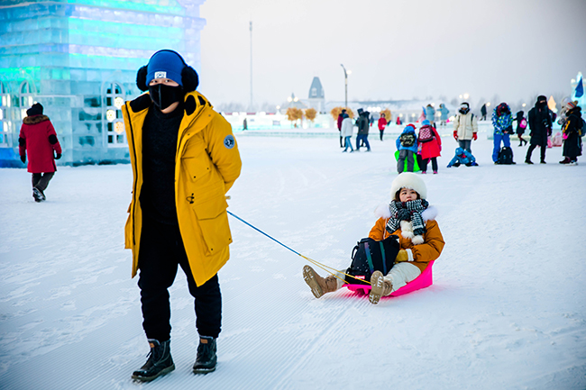 坐上大雪圈、从100多米长的雪道上滑下;骑上冰上自行车,感受在冰面奔驰的快感;带着孩子,在冰湖上抽冰尜……各地游客带领着孩子在哈尔滨冰雪大世界的冰湖、雪湖上亲身体验各种冰雪娱乐项目。