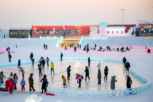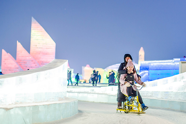 今年的哈尔滨冰雪世界共设冰雪之旅、主轴区、四大城堡区、冰雕赛事区、冰雪演艺区、祈福区、戏冰乐雪、冰上娱乐等八大区域。“听说哈尔滨冰雪大世界是世界最大的冰雪主题乐园,特意带孩子过来玩。”市民张女士一家三口,每人骑着一辆冰上自行车,体验冰面骑行的乐趣。