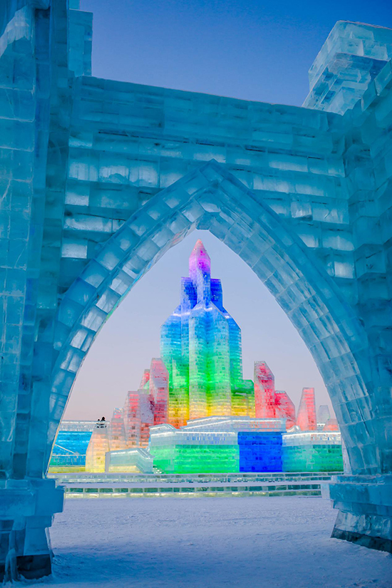 当夜幕降临,整个哈尔滨冰雪大世界的景观尽收眼底,五颜六色的冰灯光怪陆离,璀璨梦幻,你会不时地听到有人惊呼:真美!