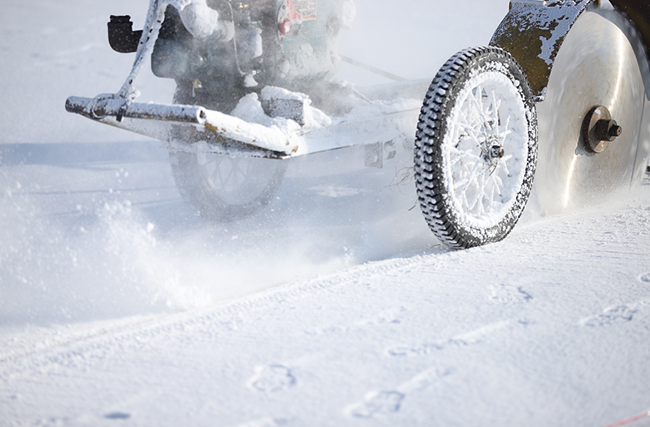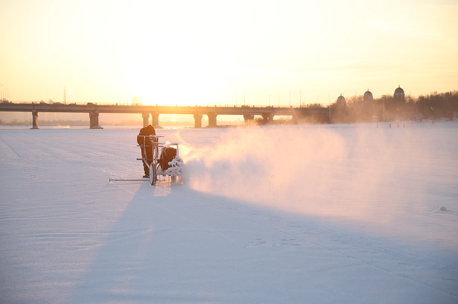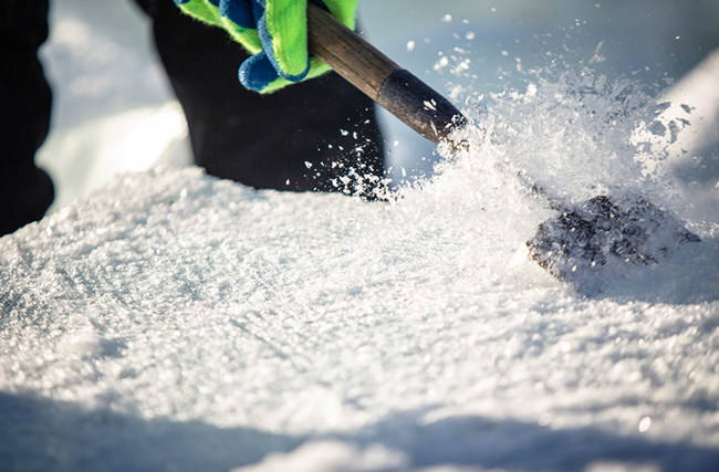 接下来采冰人将冰层上的积雪进行清理,以便后续采冰工作的顺利进行。