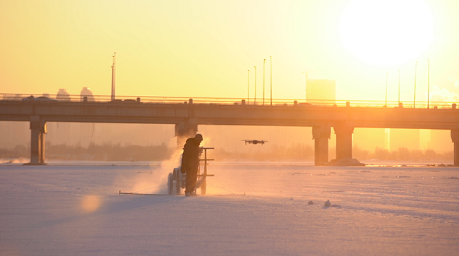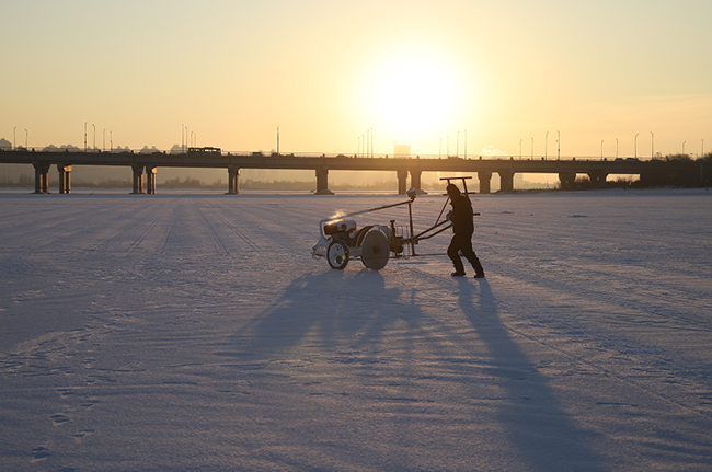 第三道工序——放线开锯。一般来说,有经验的采冰人都知道,只有冰层厚度达到24-25cm左右的时候才能开第一锯,第一次落锯深度大概20cm左右,不可以锯透,寒气透过缝隙向下走,反复几次,让冰层的厚度慢慢增长,冰层厚度达到30cm以上的时候便可以起冰了。所有采集的冰块都是依据哈尔滨冰雪大世界建设用冰的标准进行采集的。