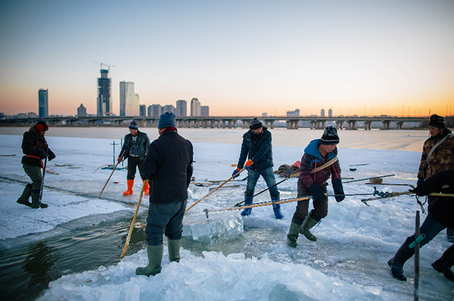 开锯后的江面上形成了大片的冰排区域,采冰人用冰镩子将冰排蹾开,完成“炸冰排”的过程。紧接着,冰排裂开缝隙,切割成块,完成“断冰块”的过程。这些冰块全部被运往哈尔滨冰雪大世界,进行景观建设。