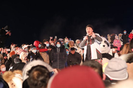 第22届哈尔滨冰雪大世界的梦想大舞台上,“左右哥”与游客欢乐互动,带领数万游客在冰天雪地里共同齐舞,点燃激情、燃爆冬夜。