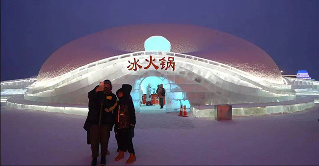 一进入哈尔滨冰雪大世界园区内这座特别的建筑里面,鼻间就被四溢的火锅香气充盈。