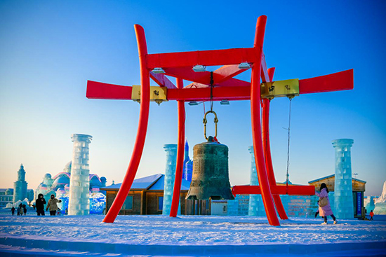 千年钟声:世纪之钟是哈尔滨冰雪大世界从第一届到现在留下来的唯一非冰景观,至今已有22年历史,见证了哈尔滨冰雪大世界的发展历程。
