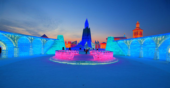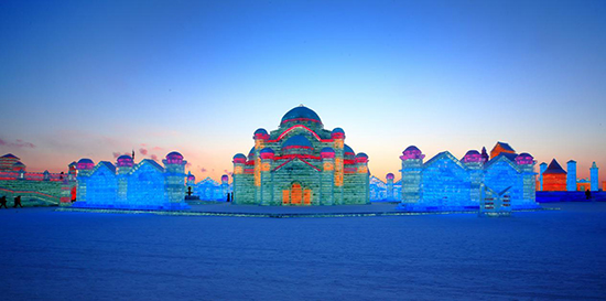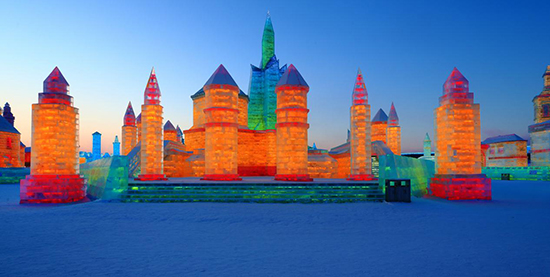 各式城堡建筑冰雪晶莹,玲珑剔透,夜晚灯光华彩,璀璨耀眼,多方位展示了中东欧的异国风情色彩。