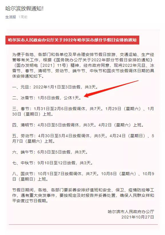 《关于2022年哈尔滨市部分节假日安排的通知》
