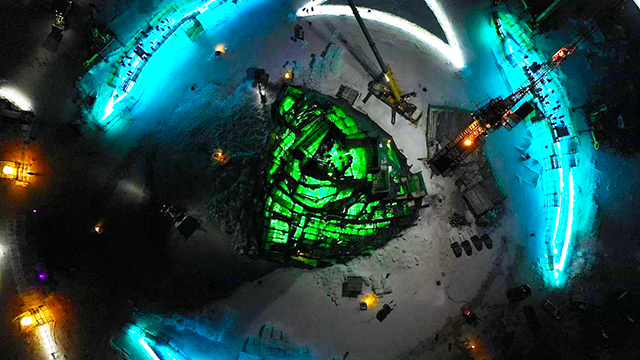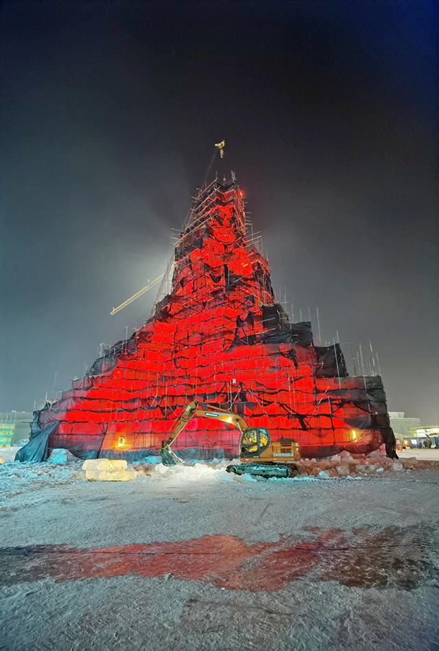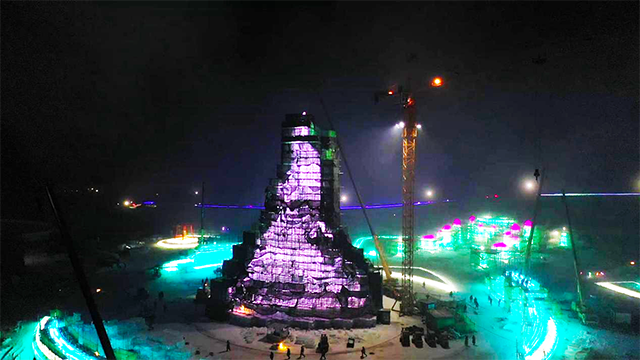 12月18日晚11时17分,第二十三届哈尔滨冰雪大世界园区主塔“圣火之巅”搭建上最后一块冰。这标志着主塔的封顶工作正式完成,“圣火之巅”已进入最后的细节打磨和灯光调试阶段。