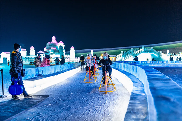 今年园区的另一个“人气王”,非单车城堡莫属。单车城堡内的冰上自行车项目,每天都吸引着大量游客骑行体验。在冰面上掌控方向不是件容易事,骑着冰上自行车,穿行于美丽的冰城堡中,对游客来说是一种前所未有的奇妙体验。