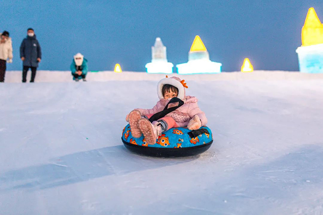 冰雪大世界园区内能带给游客速度与激情的项目还有雪圈,家长和孩子可以一同玩耍,处处充满欢声笑语。今年的雪圈分为儿童雪圈和趣味雪圈,无法乘坐大滑梯的孩子们可以在儿童雪圈感受飞一般的速度,绝对不虚此行。