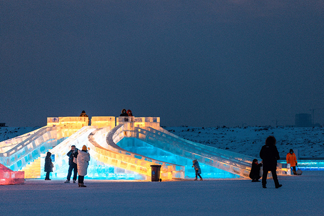 作为哈尔滨冰雪大世界最具人气的项目,今年的超级冰滑梯滑道长达423米,高低落差达21米,100米滑行速度快过苏炳添创造的9秒83新亚洲纪录,游客乘坐大滑梯时也能体验一把飞人的感觉。