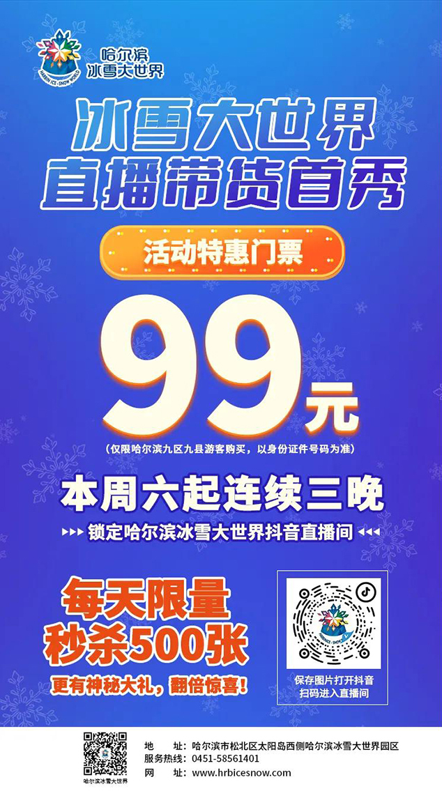 温馨提示:直播时间为18:00-21:00。保存下方海报图片,打开抖音扫描二维码,或抖音搜索“哈尔滨冰雪大世界”,即可进入直播间参与活动。