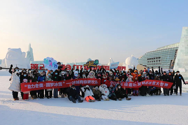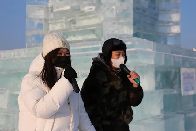 1月22日下午,FM90.9哈尔滨音乐广播《下班万岁》节目嗨三主播兴玥、阿冰带队,与热情、勇敢的听友们一起来到了哈尔滨冰雪大世界,挑战423米长、7层楼高的超级冰滑梯,园区内满是欢声笑语。