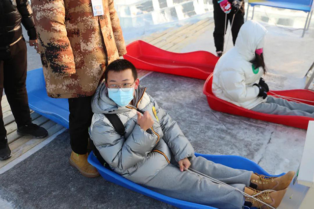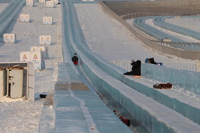 12345,冲啊!向着超级冰滑梯进发。坐上爬犁从顶端滑下,百米速度快过苏炳添,大家都是冰上飞人,好玩又刺激!