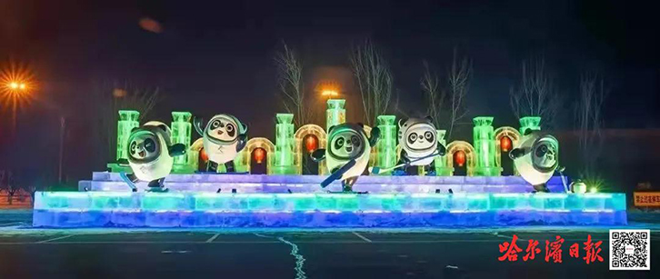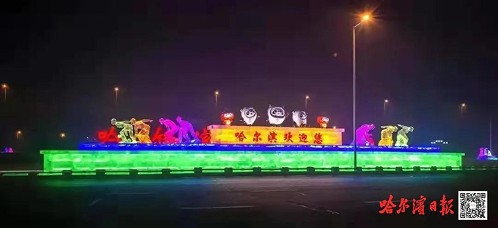 不仅仅冰雪景区“墩量十足”,在哈尔滨城区街路,“冰墩墩”也大放异彩。冰雪景观《欢喜冰墩墩》位于机场贵宾楼门前,景观规格高3米、长10米,5只形态各异的“冰墩墩”为大家展示了滑雪、冰球、冰壶等冬奥项目,火热的冬奥氛围扑面而来。冰雪景观《冰魂》位于机场路零公里环岛,它高4米、单体长30米,由5只形态各异的“冰墩墩”和“雪容融”组成,萌趣可爱,颜值极高。
