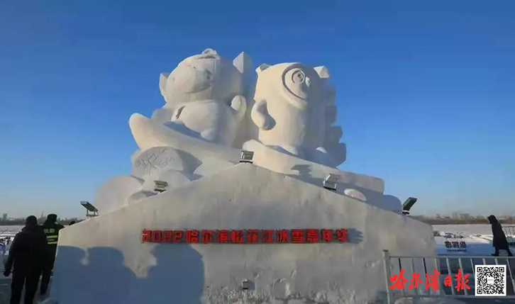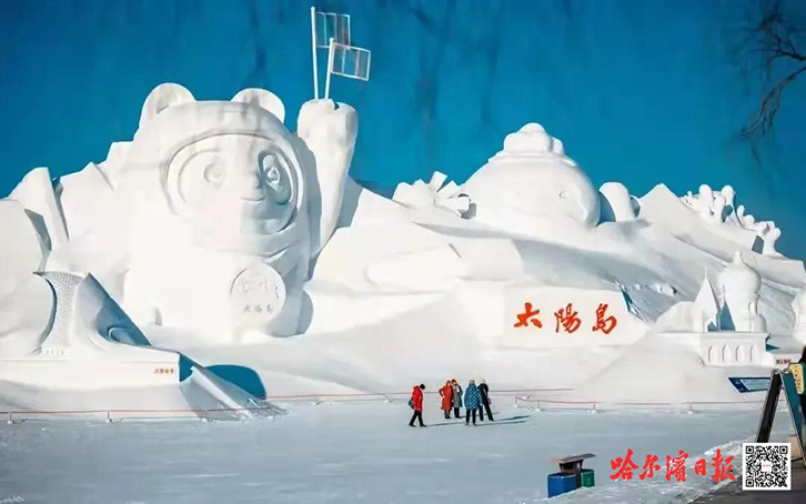 在太阳岛雪博会,大型雪塑《冬奥·太阳岛之旅》长100米高30米,相当于12层楼高,是太阳岛雪博会有史以来最大的卡通单体雪塑。看,憨态可掬的“冰墩墩”和“雪容融”正在邀请大家共赴一场浪漫的雪域之旅,尽情体验人间喜乐。