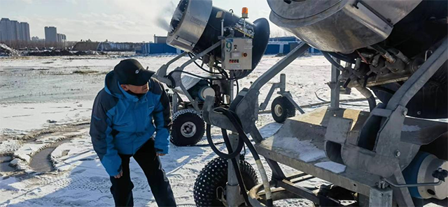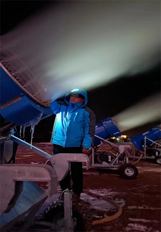 20年的经验和坚持,让他对制雪工作如数家珍。他知道各品牌的制雪机适合在什么温度下使用;知道什么风向、多大风速,制雪机的仰角多高、斜角多大,制出的雪粒易于散开还是易于聚拢;他知道不同类型的雪雕作品,应该用什么干湿度的雪。
