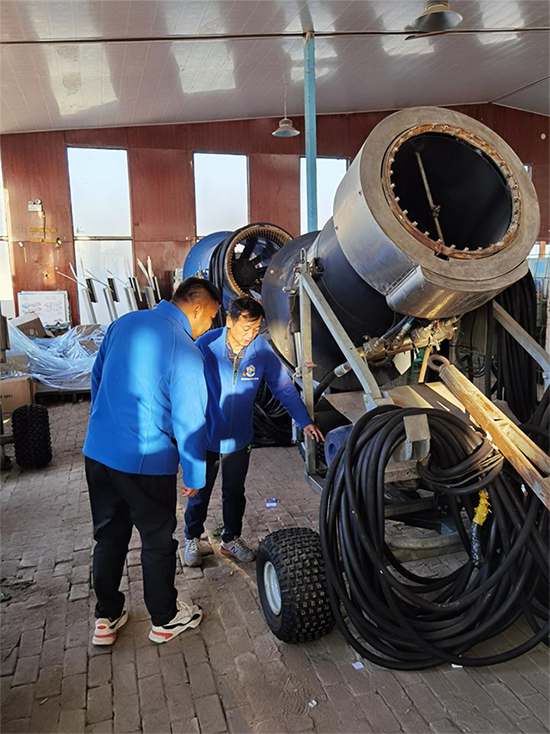 每届冰雪大世界的建设期只有短短的15天,在天气条件适合的情况下,需要每天加班加点一次性制出4-6万立方米的雪,才能满足各标段雪雕制作所需。这15天里,于光辉与其他制雪人员基本上就是昼夜不停地连轴转,困了累了,就在制雪机房或者泵房打地铺,眯上一会儿,恢复一点精神和体力就立马投入工作中。