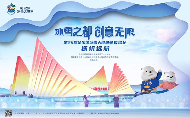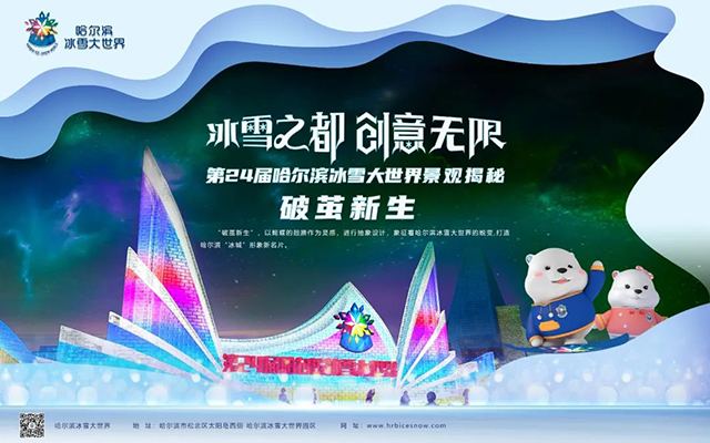 第24届哈尔滨冰雪大世界的主形象大门“破茧新生”,以蝴蝶的翅膀作为灵感,进行抽象设计,象征着哈尔滨冰雪大世界的嬗变。