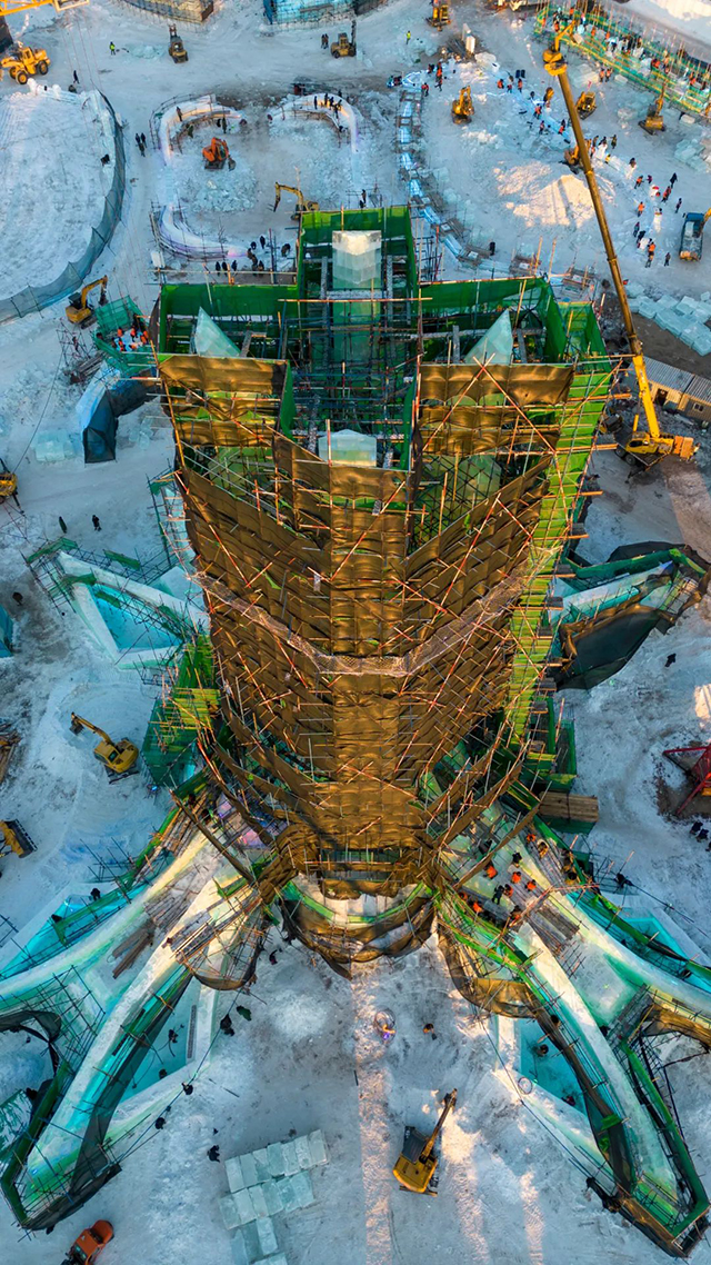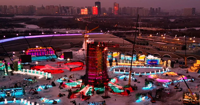 经过连日昼夜奋战,12月8日21:37,第24届哈尔滨冰雪大世界园区主塔“冰雪之冠”完成封顶,进入最后的细节打磨和灯光调试阶段。