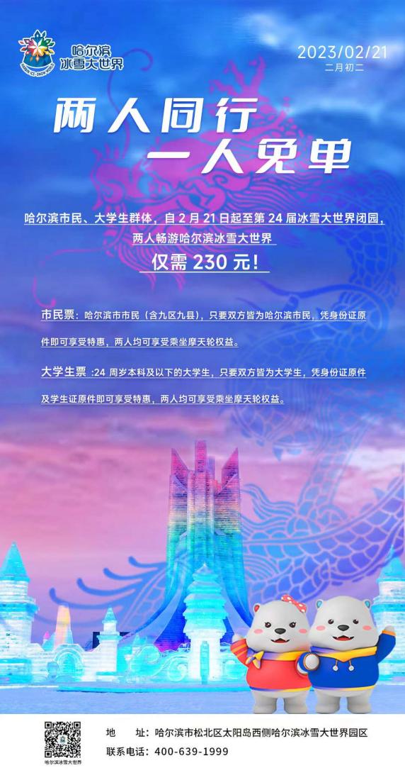 2月21日起至第24届哈尔滨冰雪大世界闭园,哈尔滨市民和大学生群体,两人畅游哈尔滨冰雪大世界,仅需230元。