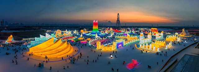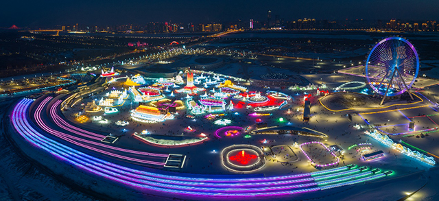 第24届哈尔滨冰雪大世界以“冰雪之都、创意无限”为主题,在81万平方米的园区里,用15万立方米的冰和雪,建成上百个冰雪景观,亮点纷呈、体验感满满。整个园区从空中俯瞰,宛如美丽的丁香花环:园区中心的花蕊是冰雪之冠、梦想大舞台、世纪之钟等主景观,园区周围的花瓣是冰上自行车、冰爬犁、冰尜等冰雪娱乐体验项目。花蕊花瓣相互串联、环环相扣,为游客打造一个美轮美奂、异彩纷呈的冰雪欢乐世界。