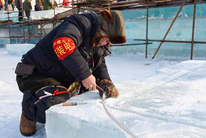 其实,冰灯白天也是亮着的,你知道吗?可能大家会和我一样觉得奇怪,这样不费电吗?我也是咨询了专门从事冰灯安装的师傅才知道,白天也要通着电,才能随时调整灯线安装的角度、弧度,同时保证各种颜色的最终呈现能达到最佳效果。
