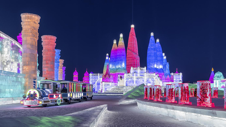 进入大门,大家可以乘坐哈尔滨之约站始发的冰雪专列畅游整个景区、也可以漫步徜徉在冰天雪地里,细细品味每一个冰建带给自己的震撼和触动。我们首先看到的是十二生肖的冰塑造型,活灵活现;接下来就是冰景闪亮、圣诞气氛浓郁的圣诞狂欢区域。