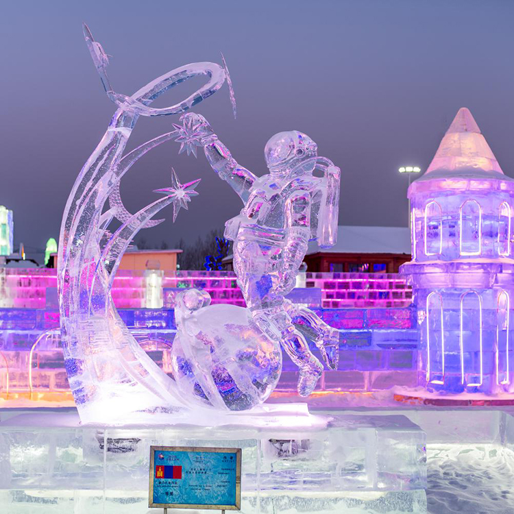 路过右手边的哈萨克小镇,就是第三十二届中国•哈尔滨国际冰雕比赛的赛场。来自法国、意大利、瑞士、荷兰、西班牙、拉脱维亚、马来西亚、蒙古、俄罗斯和中国13个国家32支代表队的64名艺术家参赛。参赛的冰雕作品立意深刻、构思巧妙,充分展现了不同国家、不同区域的风土人情和民俗文化,为哈尔滨冰雪大世界增添了一道亮丽的风景线。