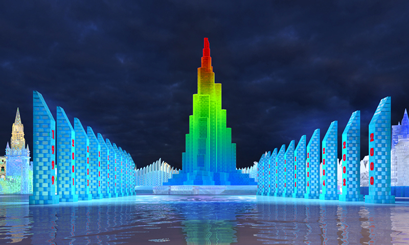 沿着主线东游,可以饱览一众标志性建筑:代表着哈尔滨冰雪大世界筑梦成功的世纪之钟、哈尔滨这座城市的原点尼古拉教堂、镌刻着哈尔滨大世界20年奋进历程的时光廊,在今年的主塔——1999世纪光塔下留念,仿佛走过了这座城市的百年历程。