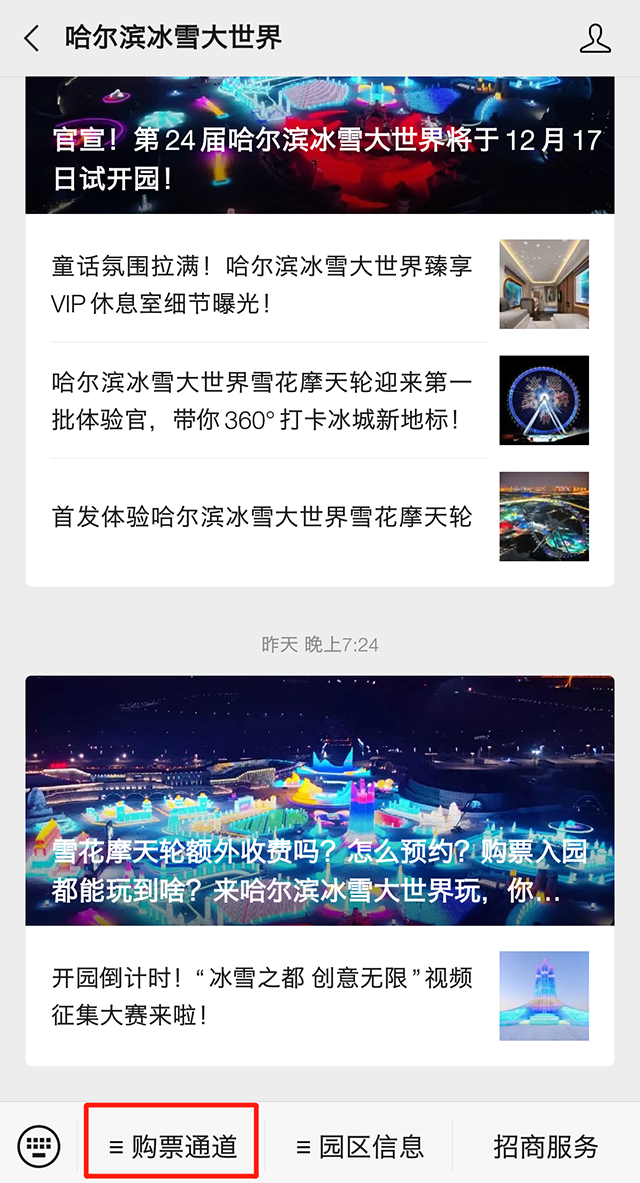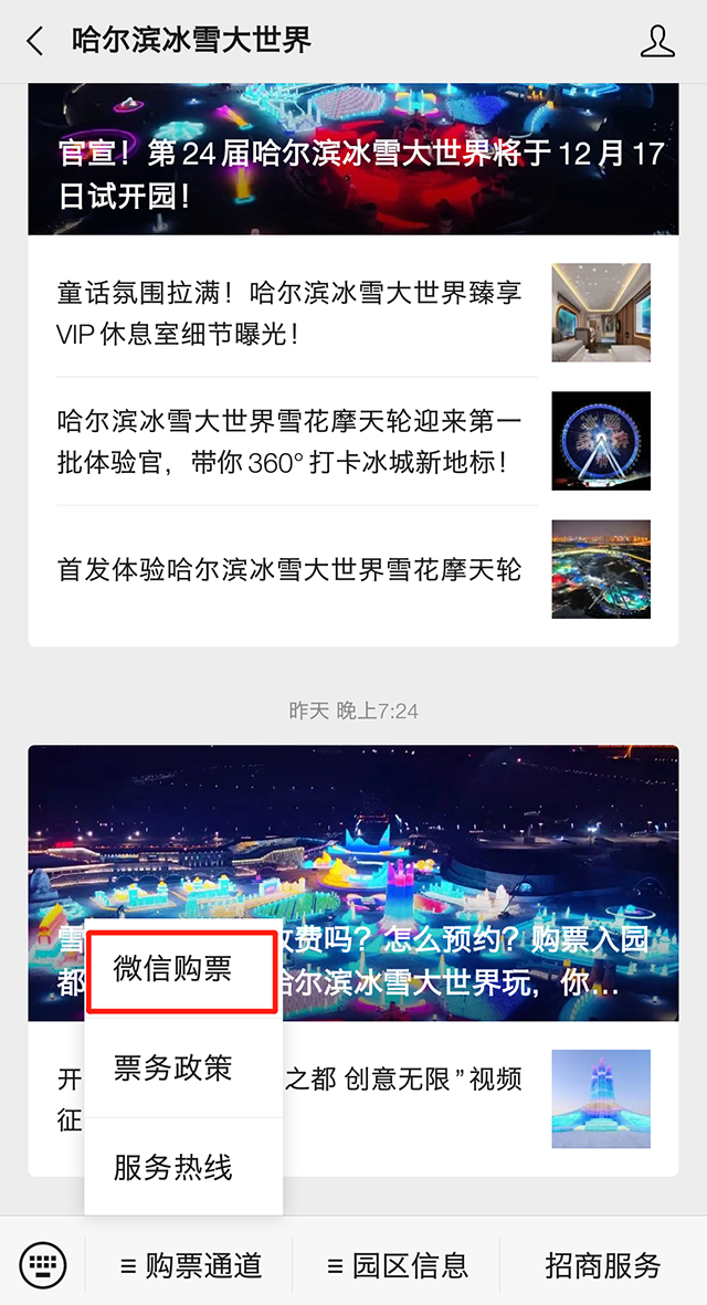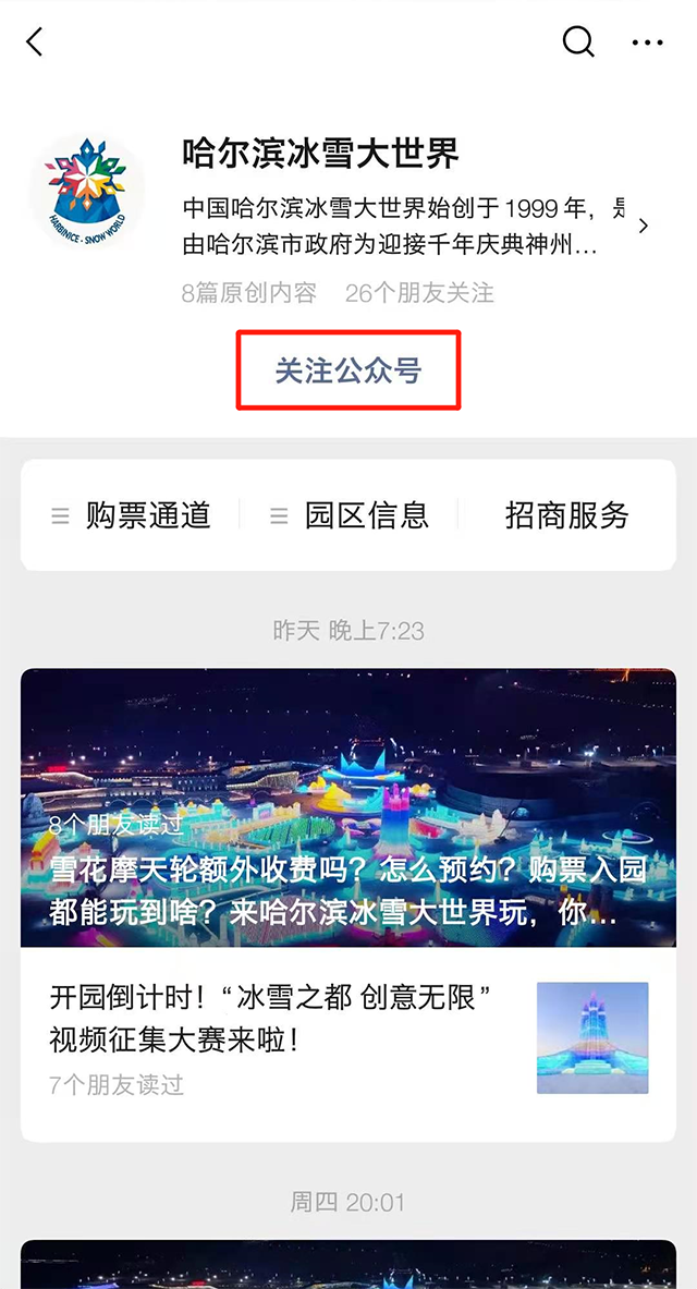 STEP 1、搜索哈尔滨冰雪大世界微信公众号