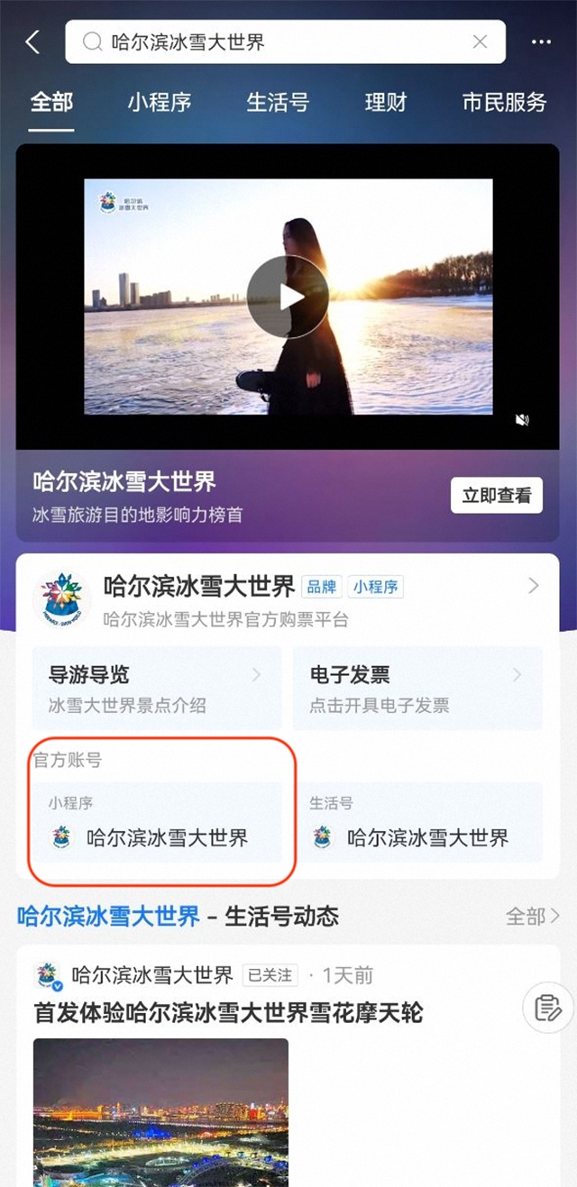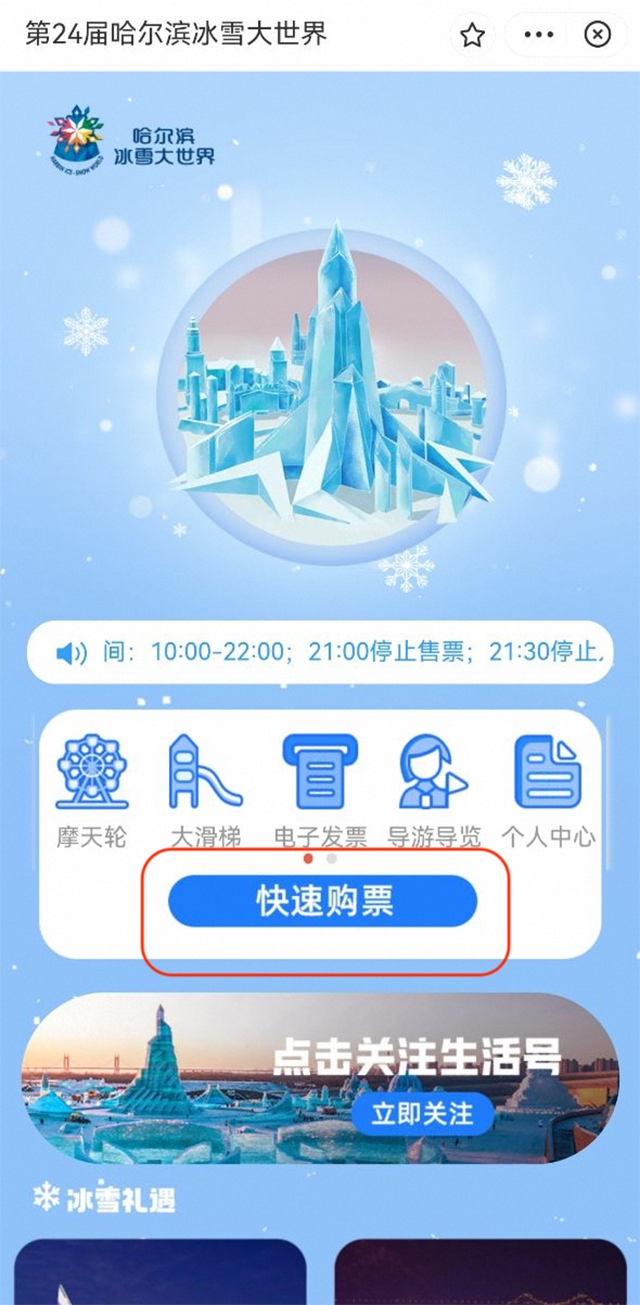 1、支付宝搜索“哈尔滨冰雪大世界”小程序购票