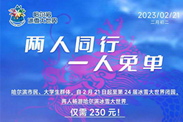 为感谢哈尔滨市民24年来对哈尔滨冰雪大世界旅游事业的支持,满足返校大学生们畅游冰雪王国的愿望,哈尔滨冰雪大世界特别推出“两人同行,一人免单”特惠活动。