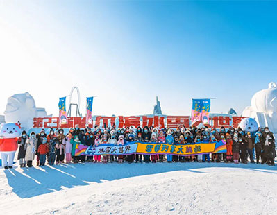 1月22日下午,FM90.9哈尔滨音乐广播《下班万岁》节目嗨三主播兴玥、阿冰带队,与热情、勇敢的听友们一起来到了哈尔滨冰雪大世界,挑战423米长、7层楼高的超级冰滑梯,园区内满是欢声笑语。