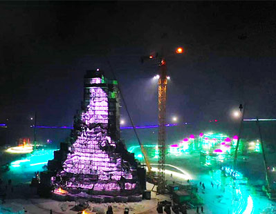 12月18日晚11时17分,第二十三届哈尔滨冰雪大世界园区主塔“圣火之巅”搭建上最后一块冰。这标志着主塔的封顶工作正式完成,“圣火之巅”已进入最后的细节打磨和灯光调试阶段。