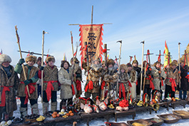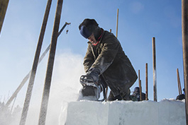 盼望着,盼望着, 一年一度冰雕盛宴即将拉开序幕! 12月3日,农历十月十五,10:18, 零下20 ℃的松花江江面上, 近百名冰汉子穿着东北传统服饰, 敲着锣鼓、喊着号子, 带着对自然的敬仰, 哈尔滨冰雪大世界第三届采冰节正式启动!