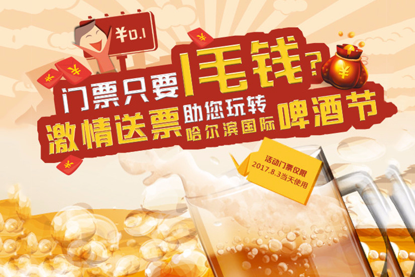 关注中国哈尔滨国际啤酒节公众帐号,即可参加抢票活动,一毛抢哈尔滨国际啤酒节门票就在这里