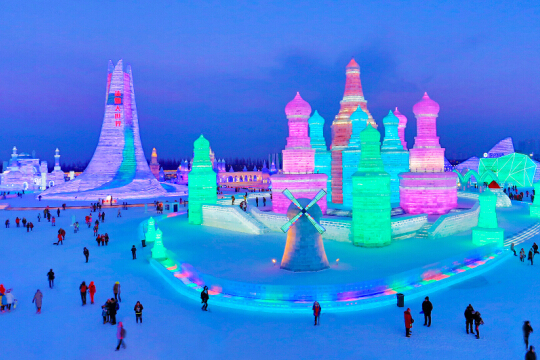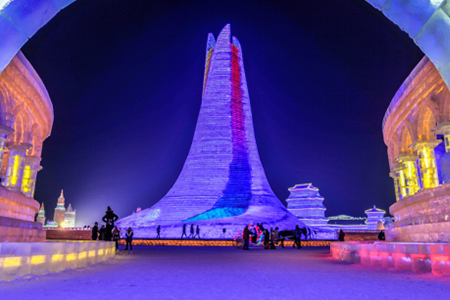 哈尔滨冰雪大世界主题乐园是目前世界面积最大,冰景数量最多,单体体量最大的室内冰雪乐园。馆内冰灯采用天然冰和彩色冰雕琢制成,每一座冰建筑都被赋予了灵魂和生命。
