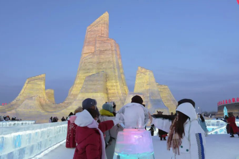在第二十七届哈尔滨冰雪大世界的园区内,一组融合多地文化标志的主宾省、市景观群已成为今冬最受关注的打卡地标之一。