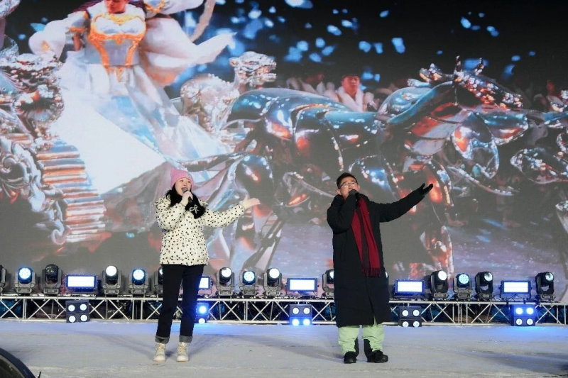 来自福建的音乐人蒋舟与歌手陈姿联袂登场,在冰雕玉砌的童话世界里,为天南海北的游客带来了一缕清新的闽地气息,吸引众多游客驻足欣赏。