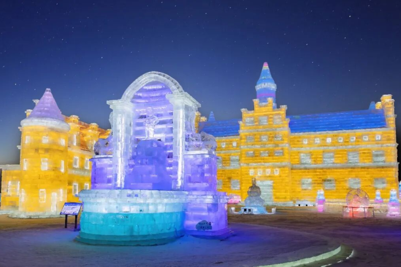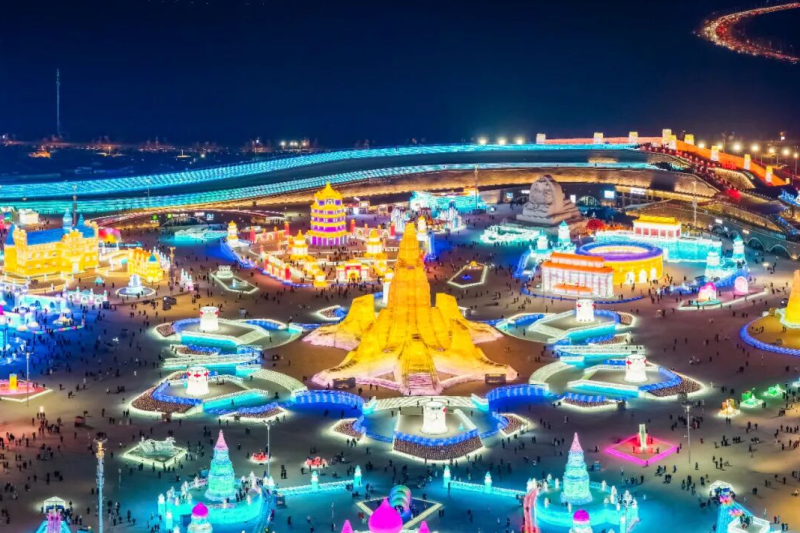 各式冰雪景观巧夺天工、互动体验妙趣横生,园区之外的整体亮化工程与景观布置亦独具匠心,灯光璀璨如星河洒落,各类装饰元素与冰雪主题交相辉映,营造出浓厚的欢乐氛围和独特的北国风情。