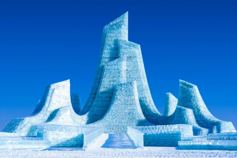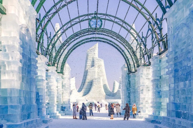 第二十七届哈尔滨冰雪大世界中,最受游客喜爱的莫过于中华巴洛克景观群,这里不仅有着全冰雕刻的中华巴洛克老建筑,更匠心打造一条飘雪的网红街道。