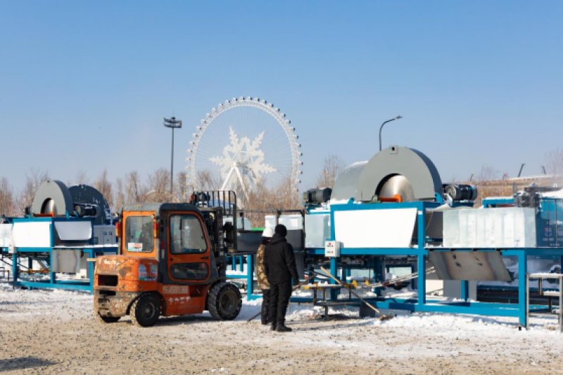 在所有冰雪人的共同努力下,哈尔滨冰雪大世界的冰雪景观建设已进入冲刺阶段。与往年不同的是,今冬的工地上迎来了两位特殊的“新员工”——智能自动化标准冰砌块生产设备,它们正开足马力,将毛冰快速、精确地切割成平整光滑的标准冰砌块。