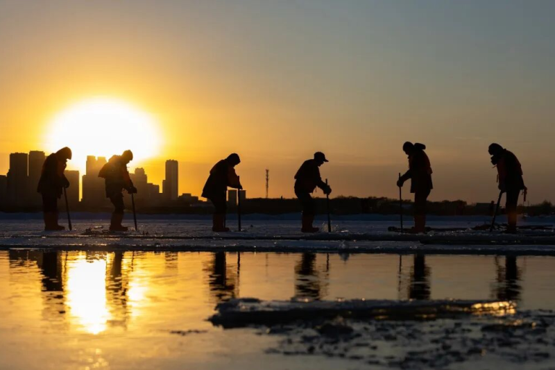 一阵有节奏的撞击声撕破寂静。衣凤龙双手紧握冰镩,高高举起,重重砸下。他是这片冰原之上,最早唤醒松花江的人之一。