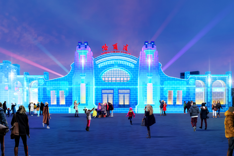 今天,第二十七届哈尔滨冰雪大世界主形象大门冰建施工顺利完成,开启细节打磨与灯光调试的“美颜”模式。
